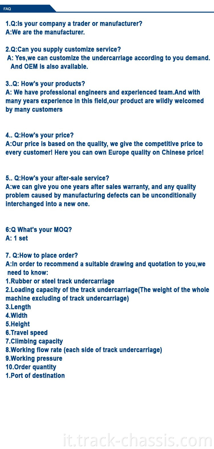 3) Utilizziamo il motore a due velocità su questo modello di pista crawler di gomma, quando si trasferisce da un luogo all'altro può viaggiare nella velocità rapida, quando funziona, può sfogliare a bassa velocità. Questo può adattarsi al meglio alle tue esigenze. Se hai bisogno di una gamma di velocità più ampia, è possibile scegliere una pompa di spostamento variabile con motore a spostamento di fila. Dipende dalle tue esigenze.